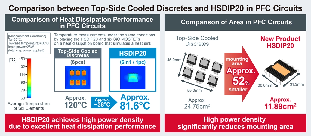 As a result, in the PFC circuit mentioned above, the HSDIP20 can reduce mounting area by approx. 52% compared to top-side cooled discrete configurations, greatly contributing to the miniaturization of power conversion circuits in applications such as OBCs.